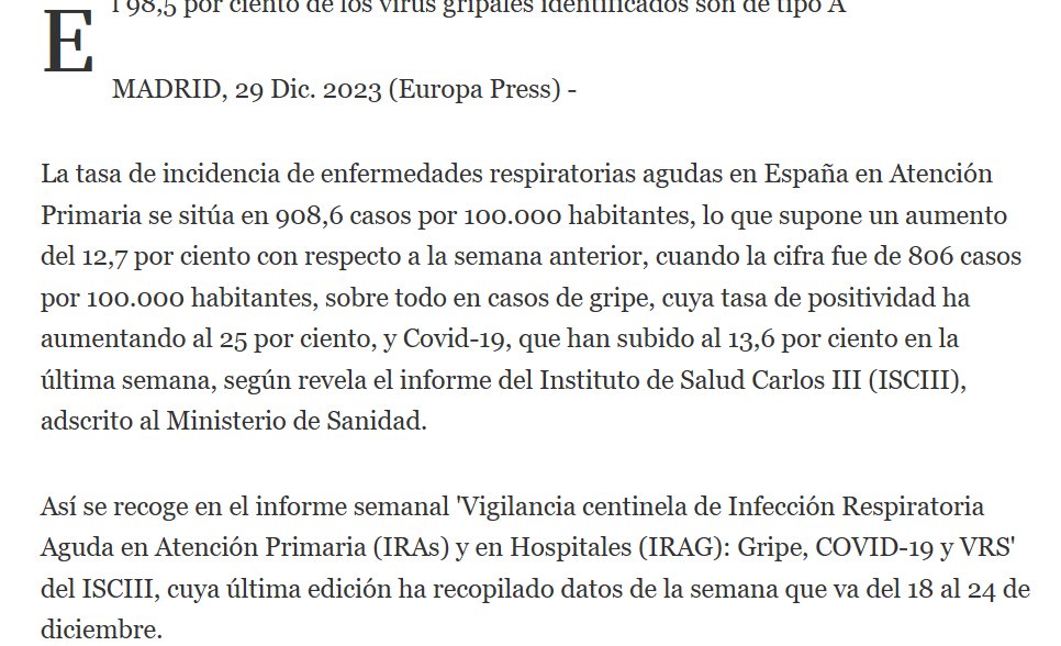 COVID+POSTCOVID=PANDEMIA ETERNA! ESPAÑA La tasa de positividad de la gripe sube al 25% y la de la Covid-19 al 14%, según Sanidad Posted on diciembre 30, 2023 por coronado https://www.lanacion.com.ar/agencias/la-tasa-de-positividad-de-la-gripe-sube-al-25-y-la-de-la-covid-19-al-14-segun-sanidad-nid29122023/