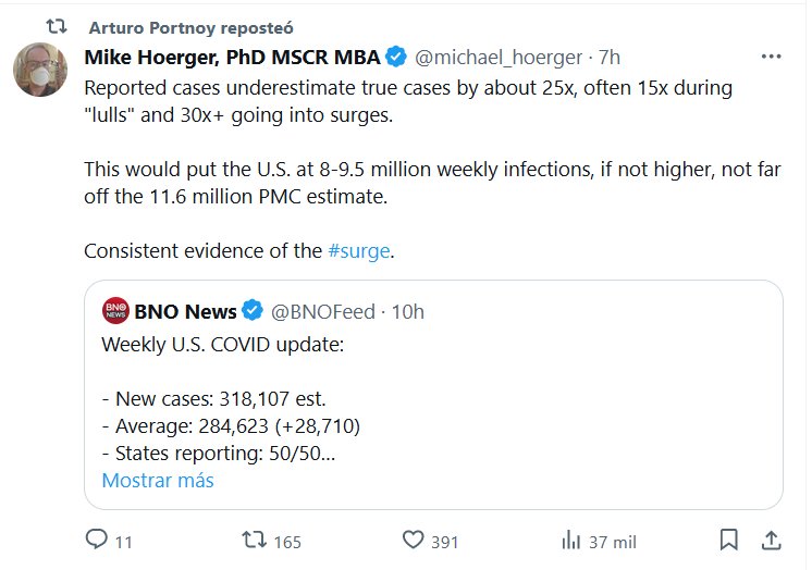 «FIN DE PANDEMIA» EN INGLÉS Los casos notificados subestiman los casos reales aproximadamente 25 veces, a menudo 15 veces durante las «pausas» y 30 veces más durante los picos. Esto situaría a Estados Unidos entre 8 y 9,5 millones de infecciones semanales, si no más, no muy lejos de los 11,6 millones, estima el PMC. Evidencia consistente del #aumento