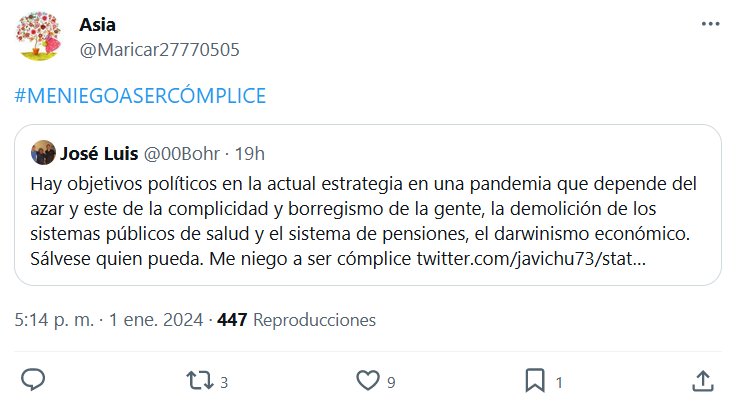 #MENIEGOASERCÓMPLICE Hay objetivos políticos en la actual estrategia en una pandemia que depende del azar y éste de la complicidad y borregismo de la gente, la demolición de los sistemas públicos de salud y el sistema de pensiones, el darwinismo económico. Sálvese quien pueda. Me niego a ser cómplice