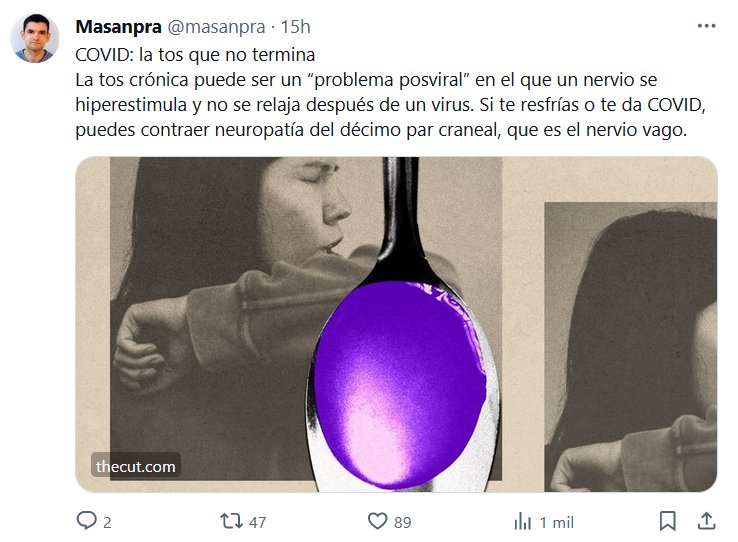 COVID: la tos que no termina La tos crónica puede ser un “problema posviral” en el que un nervio se hiperestimula y no se relaja después de un virus. Si te resfrías o te da COVID, puedes contraer neuropatía del décimo par craneal, que es el nervio vago