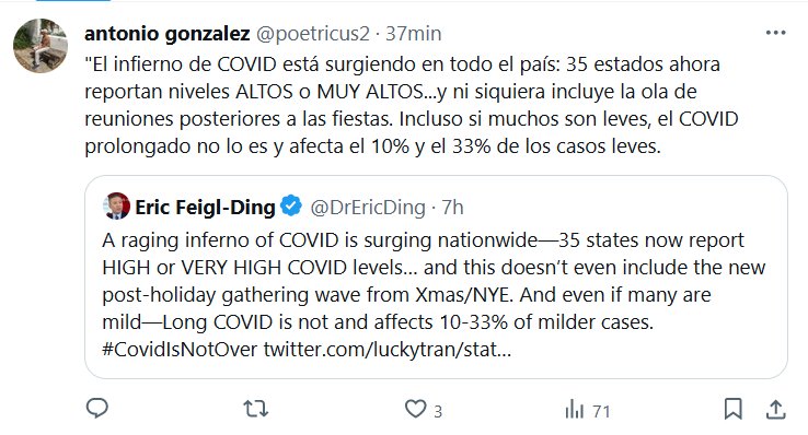 «El infierno de COVID está surgiendo en todo el país: 35 estados ahora reportan niveles ALTOS o MUY ALTOS…y ni siquiera incluye la ola de reuniones posteriores a las fiestas. Incluso si muchos son leves, el COVID prolongado no lo es y afecta el 10% y el 33% de los casos leves»