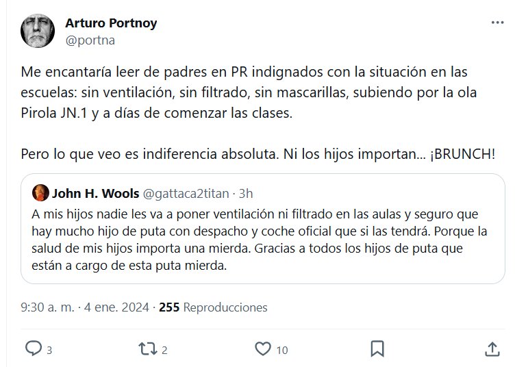 EL MAL PASTOR HIERVE RANAS Me encantaría leer de padres en PR indignados con la situación en las escuelas: sin ventilación, sin filtrado, sin mascarillas, subiendo por la ola Pirola JN.1 y a días de comenzar las clases. Pero lo que veo es indiferencia absoluta. Ni los hijos importan… ¡BRUNCH!