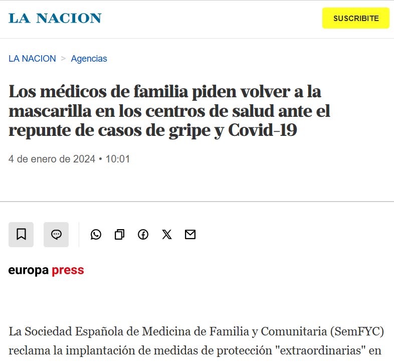 Los médicos de familia piden volver a la mascarilla en los centros de salud ante el repunte de casos de gripe y Covid-19 Posted on enero 4, 2024 por coronado https://www.lanacion.com.ar/agencias/los-medicos-de-familia-piden-volver-a-la-mascarilla-en-los-centros-de-salud-ante-el-repunte-de-casos-nid04012024/