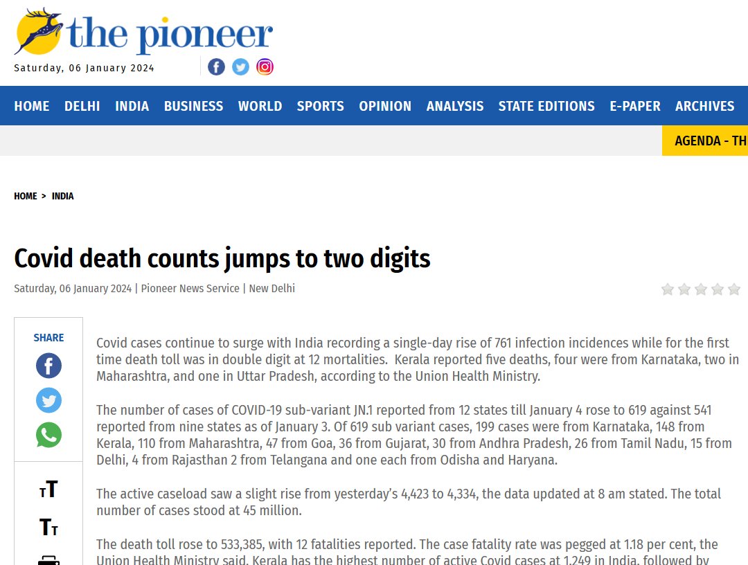 ES LEVE PERO MATA! INDIA (EN INGLÉS) El recuento de muertes por Covid salta a dos dígitos Posted on enero 5, 2024 por coronado https://www.dailypioneer.com/2024/india/covid-death-counts-jumps-to-two-digits.html