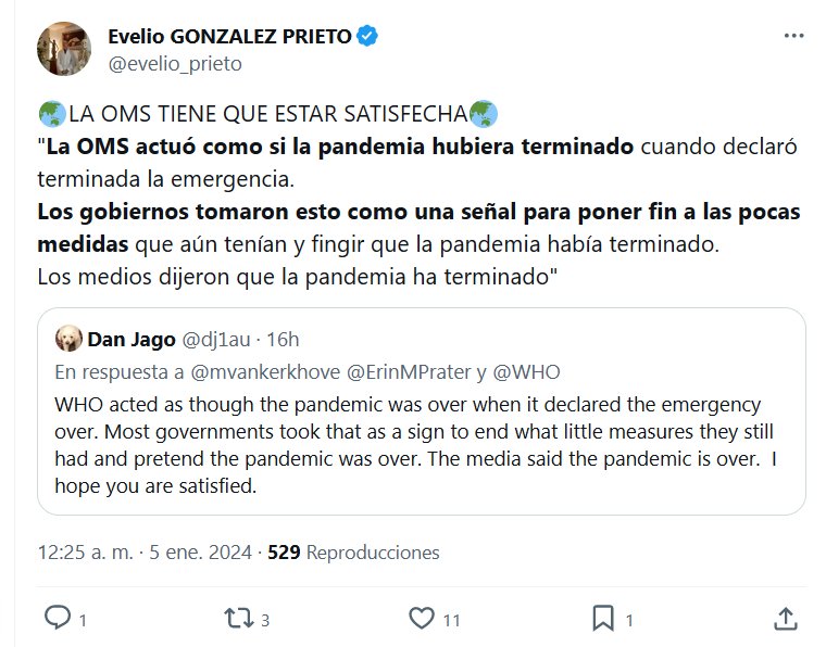 ORGANIZACIÓN MUNDIAL DE LA SALUD O DE LA ENFERMEDAD? 🌏LA OMS TIENE QUE ESTAR SATISFECHA🌏 «La OMS actuó como si la pandemia hubiera terminado cuando declaró terminada la emergencia. Los gobiernos tomaron esto como una señal para poner fin a las pocas medidas que aún tenían y fingir que la pandemia había terminado. Los medios dijeron que la pandemia ha terminado»