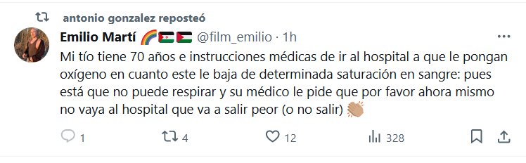 LA ÚNICA VERDAD ES LA REALIDAD, AUNQUE NO SE MENCIONE Mi tío tiene 70 años e instrucciones médicas de ir al hospital a que le pongan oxígeno en cuanto este le baja de determinada saturación en sangre: pues está que no puede respirar y su médico le pide que por favor ahora mismo no vaya al hospital que va a salir peor (o no salir) 👏🏽
