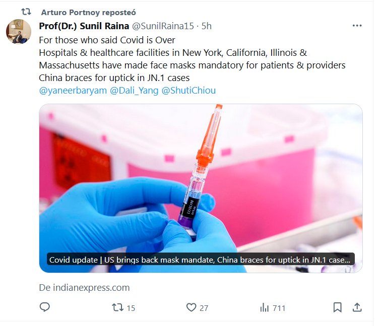 EN INGLÉS Para aquellos que dijeron que Covid ha terminado Los hospitales y centros de atención médica en Nueva York, California, Illinois y Massachusetts han hecho que las máscaras faciales sean obligatorias para pacientes y proveedores. China se prepara para un repunte de casos de JN.1
