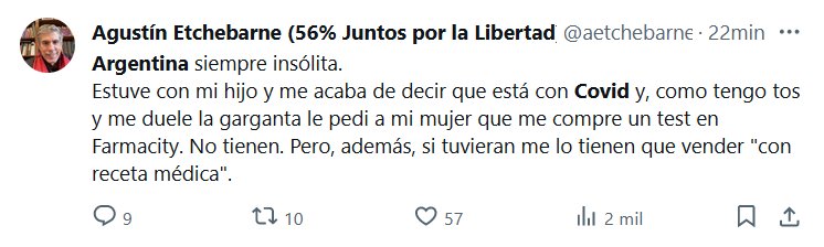 ARGENTINA APESTA! TESTIMONIOS Estuve con mi hijo y me acaba de decir que está con Covid y, como tengo tos y me duele la garganta le pedi a mi mujer que me compre un test en Farmacity. No tienen. Pero, además, si tuvieran me lo tienen que vender «con receta médica»