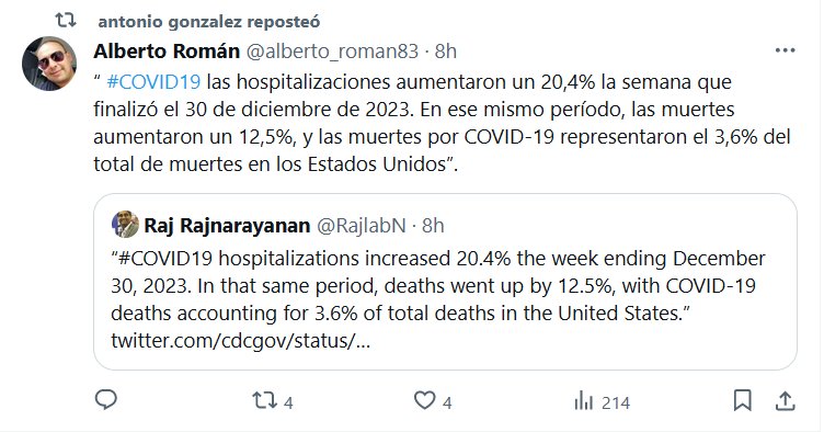 “ #COVID19 las hospitalizaciones aumentaron un 20,4% la semana que finalizó el 30 de diciembre de 2023. En ese mismo período, las muertes aumentaron un 12,5%, y las muertes por COVID-19 representaron el 3,6% del total de muertes en los Estados Unidos”