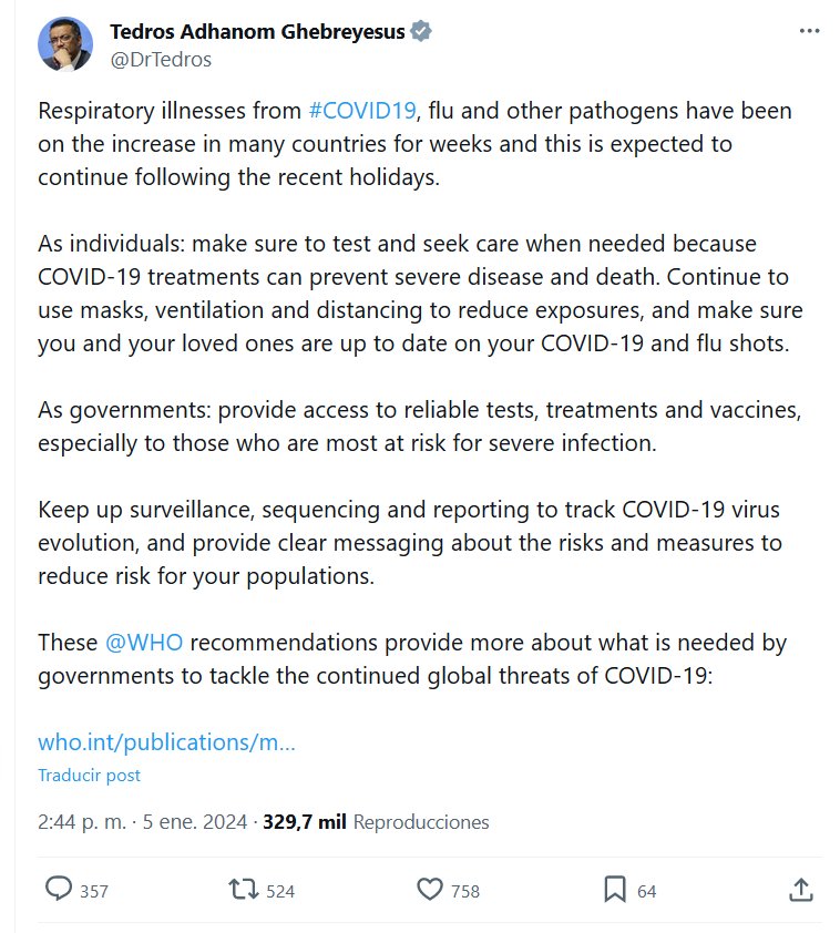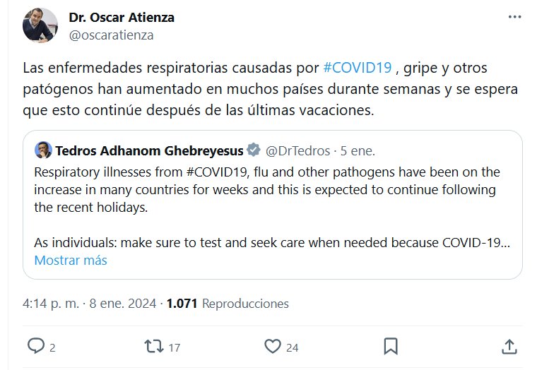 Dr. Oscar Atienza @oscaratienza Las enfermedades respiratorias causadas por #COVID19 , gripe y otros patógenos han aumentado en muchos países durante semanas y se espera que esto continúe después de las últimas vacaciones.