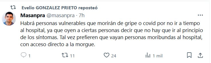 Habrá personas vulnerables que morirán de gripe o covid por no ir a tiempo al hospital, ya que oyen a ciertas personas decir que no hay que ir al principio de los síntomas. Tal vez prefieren que vayan personas moribundas al hospital, con acceso directo a la morgue.