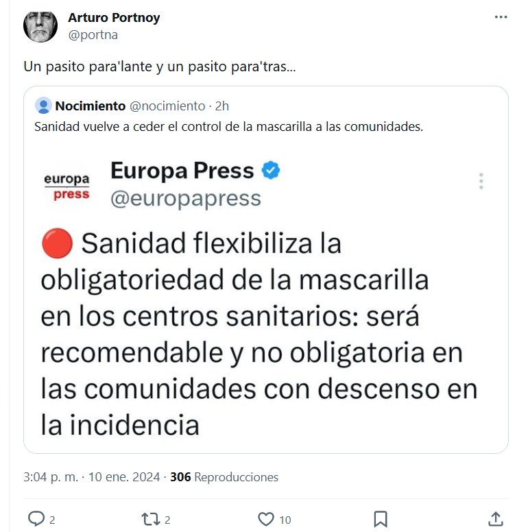 Un pasito para’lante y un pasito para’tras… Sanidad vuelve a ceder el control de la mascarilla a las comunidades Posted on enero 10, 2024 por coronado