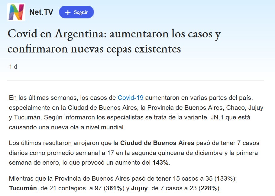 NUNCA SE FUE PERO YA VOLVIÓ Covid en Argentina: aumentaron los casos y confirmaron nuevas cepas existentes Posted on enero 11, 2024 por coronado https://www.msn.com/es-ar/noticias/other/covid-en-argentina-aumentaron-los-casos-y-confirmaron-nuevas-cepas-existentes/ar-AA1mHILS