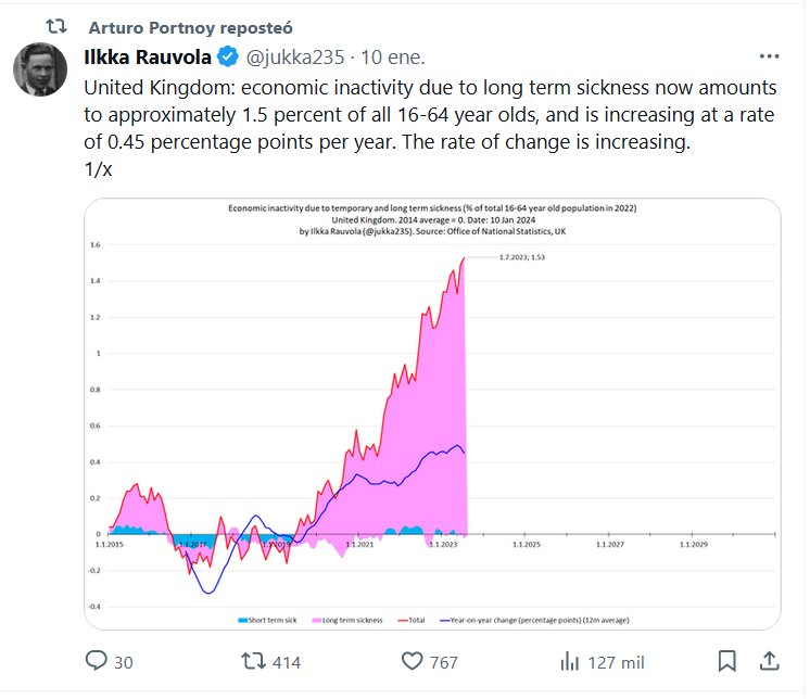 SEGURO QUE PANDEMIA LIBERADA FUE BUENA IDEA? EN INGLÉS Reino Unido: la inactividad económica debido a enfermedades de larga duración asciende actualmente a aproximadamente el 1,5 por ciento de todas las personas entre 16 y 64 años, y está aumentando a un ritmo de 0,45 puntos porcentuales por año. La tasa de cambio está aumentando
