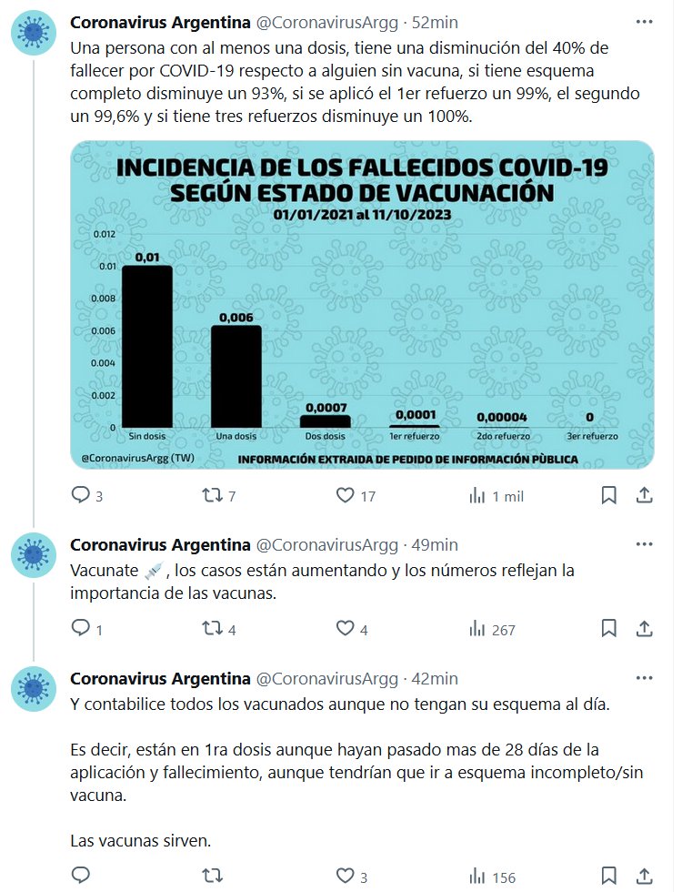 Una persona con al menos una dosis, tiene una disminución del 40% de fallecer por COVID-19 respecto a alguien sin vacuna, si tiene esquema completo disminuye un 93%, si se aplicó el 1er refuerzo un 99%, el segundo un 99,6% y si tiene tres refuerzos disminuye un 100%.