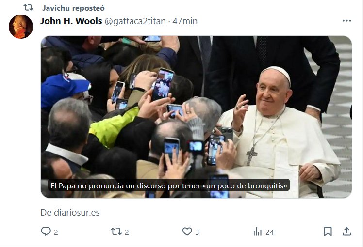NODIGASQUEESCOVID HACE ESTRAGOS! El Papa no pronuncia un discurso por tener «un poco de bronquitis» Posted on enero 12, 2024 por coronado https://www.diariosur.es/sociedad/papa-pronuncia-discurso-tener-poco-bronquitis-20240112135106-ntrc.html