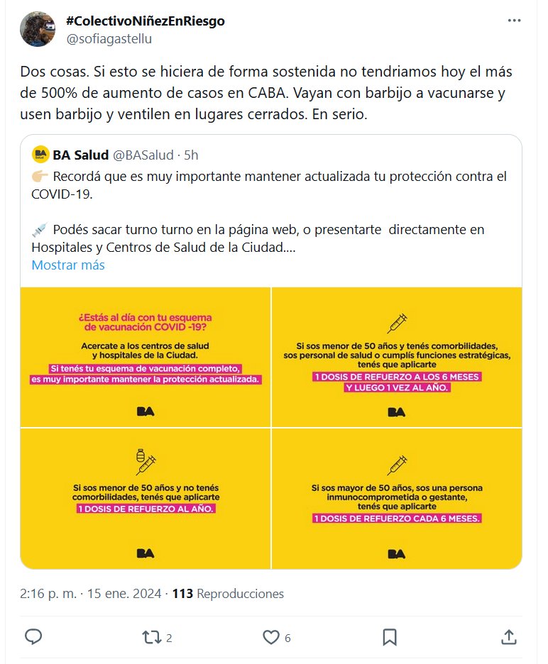 #ColectivoNiñezEnRiesgo @sofiagastellu Dos cosas. Si esto se hiciera de forma sostenida no tendriamos hoy el más de 500% de aumento de casos en CABA. Vayan con barbijo a vacunarse y usen barbijo y ventilen en lugares cerrados. En serio.