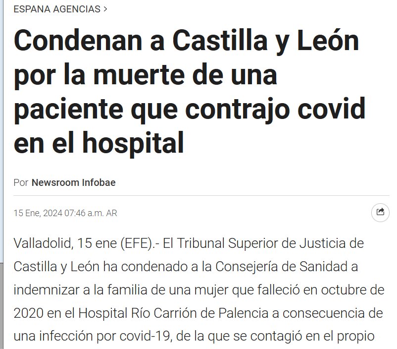 EMPIEZAN LOS JUICIOS Condenan a Castilla y León por la muerte de una paciente que contrajo covid en el hospital Posted on enero 15, 2024 por coronado https://www.infobae.com/espana/agencias/2024/01/15/condenan-a-castilla-y-leon-por-la-muerte-de-una-paciente-que-contrajo-covid-en-el-hospital/