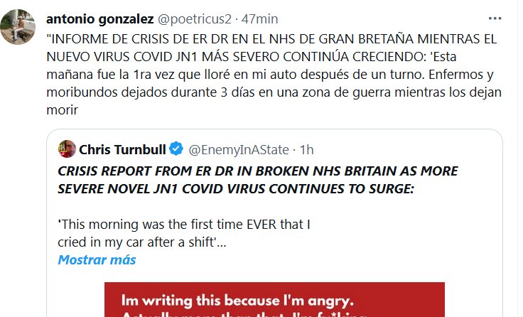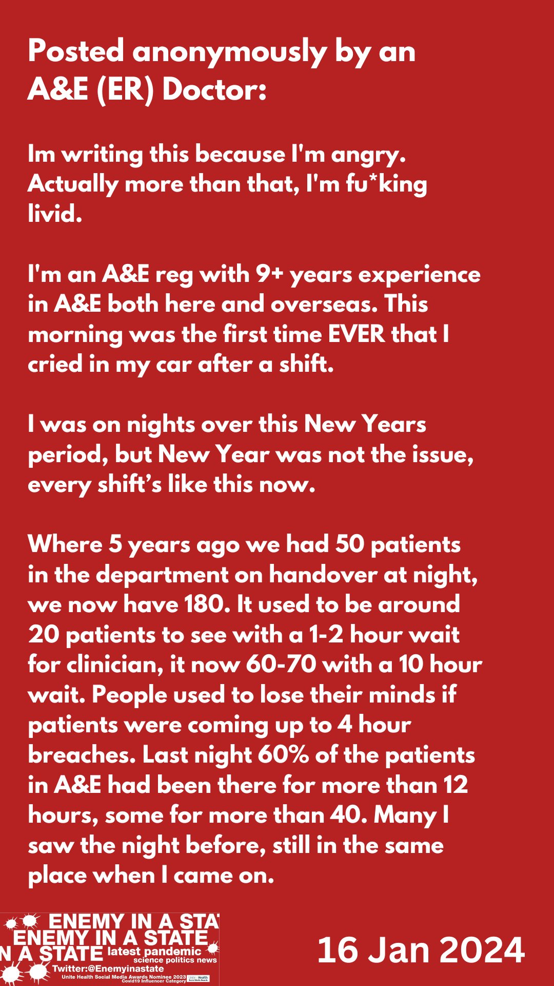 EN INGLÉS: INFORME DE CRISIS DE ER DR EN EL NHS DE GRAN BRETAÑA MIENTRAS EL NUEVO VIRUS COVID JN1 MÁS SEVERO CONTINÚA CRECIENDO: ‘Esta mañana fue la primera vez que Lloré en mi auto después de un turno. -Enfermos y moribundos dejados durante 3 días en una zona de guerra como A&E/ER mientras los dejan morir -Casi 4 veces más…