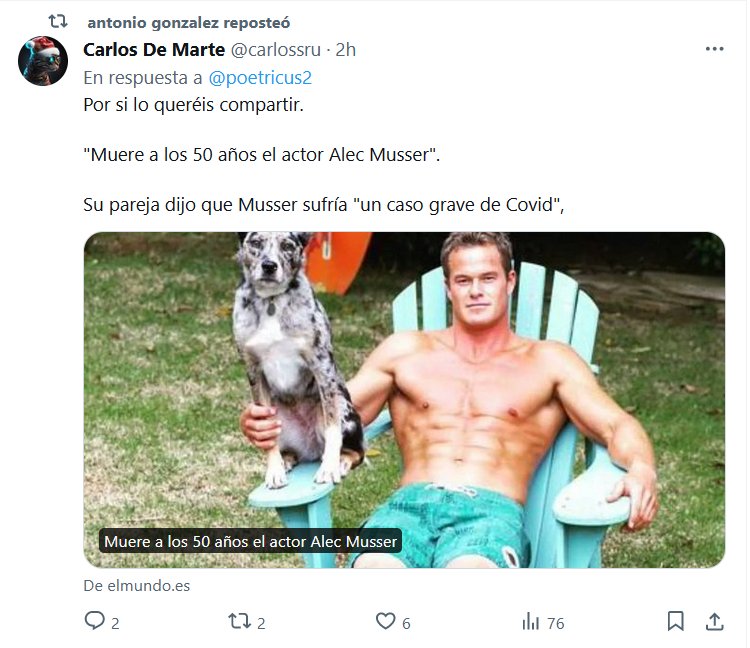 SERÍA QUE NO ERA JOVEN Y SANO? Por si lo queréis compartir. «Muere a los 50 años el actor Alec Musser». Su pareja dijo que Musser sufría «un caso grave de Covid» Posted on enero 15, 2024 por coronado