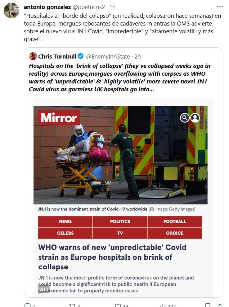 «Hospitales al «borde del colapso» (en realidad, colapsaron hace semanas) en toda Europa, morgues rebosantes de cadáveres mientras la OMS advierte sobre el nuevo virus JN1 Covid, «impredecible» y «altamente volátil» y más grave».