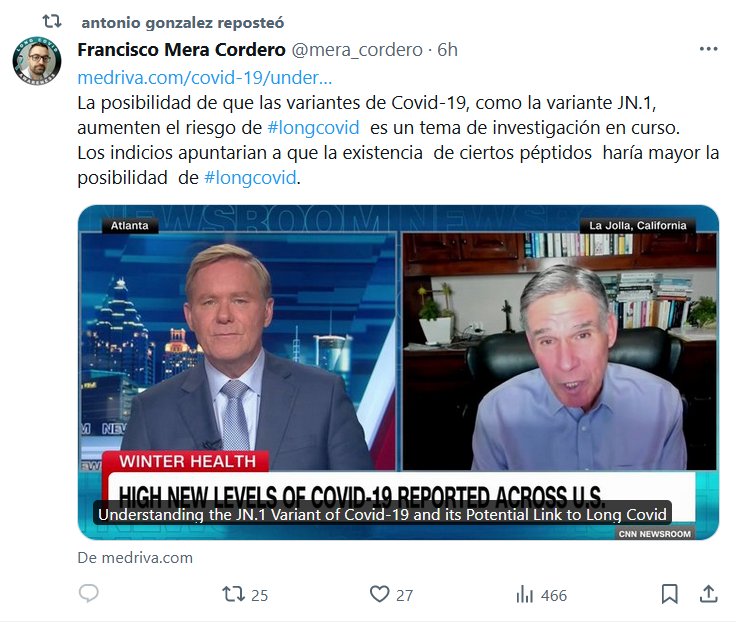 La posibilidad de que las variantes de Covid-19, como la variante JN.1, aumenten el riesgo de #longcovid es un tema de investigación en curso. Los indicios apuntarian a que la existencia de ciertos péptidos haría mayor la posibilidad de #longcovid