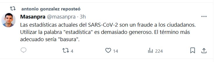 Las estadísticas actuales del SARS-CoV-2 son un fraude a los ciudadanos. Utilizar la palabra «estadística» es demasiado generoso. El término más adecuado sería «basura» Posted on enero 17, 2024 por coronado Y A ESTO LE SIGUEN LLAMANDO "CIENCIA" !