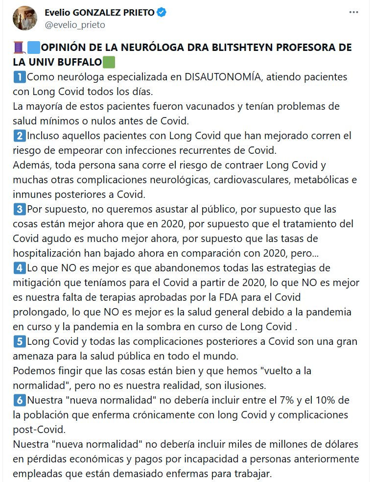 🟦OPINIÓN DE LA NEURÓLOGA DRA BLITSHTEYN PROFESORA DE LA UNIV BUFFALO🟩 1⃣Como neuróloga especializada en DISAUTONOMÍA, atiendo pacientes con Long Covid todos los días. La mayoría de estos pacientes fueron vacunados y tenían problemas de salud mínimos o nulos antes de Covid. 2⃣Incluso aquellos pacientes con Long Covid que han mejorado corren el riesgo de empeorar con infecciones recurrentes de Covid. Además, toda persona sana corre el riesgo de contraer Long Covid y muchas otras complicaciones neurológicas, cardiovasculares, metabólicas e inmunes posteriores a Covid.