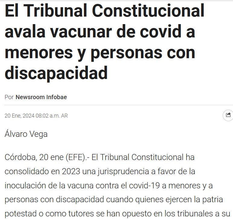 ESPAÑA El Tribunal Constitucional avala vacunar de covid a menores y personas con discapacidad Posted on enero 20, 2024 por coronado https://www.infobae.com/espana/agencias/2024/01/20/el-tribunal-constitucional-avala-vacunar-de-covid-a-menores-y-personas-con-discapacidad/
