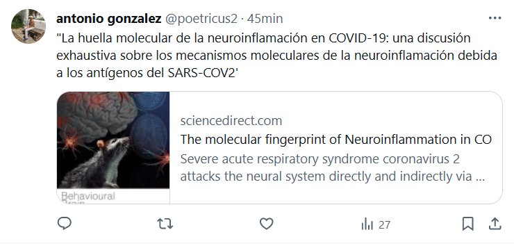 «La huella molecular de la neuroinflamación en COVID-19: una discusión exhaustiva sobre los mecanismos moleculares de la neuroinflamación debida a los antígenos del SARS-COV2′ Posted on enero 20, 2024 por coronado https://www.sciencedirect.com/science/article/abs/pii/S016643282400024X