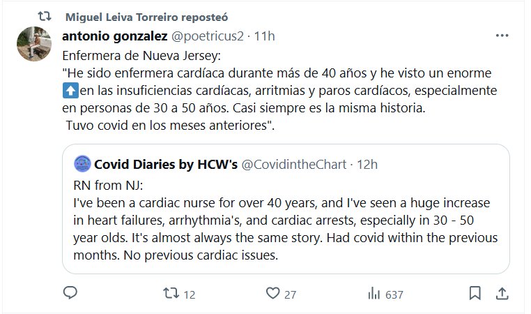 TESTIMONIO Enfermera de Nueva Jersey: «He sido enfermera cardíaca durante más de 40 años y he visto un enorme ⬆️en las insuficiencias cardíacas, arritmias y paros cardíacos, especialmente en personas de 30 a 50 años. Casi siempre es la misma historia. Tuvo covid en los meses anteriores».