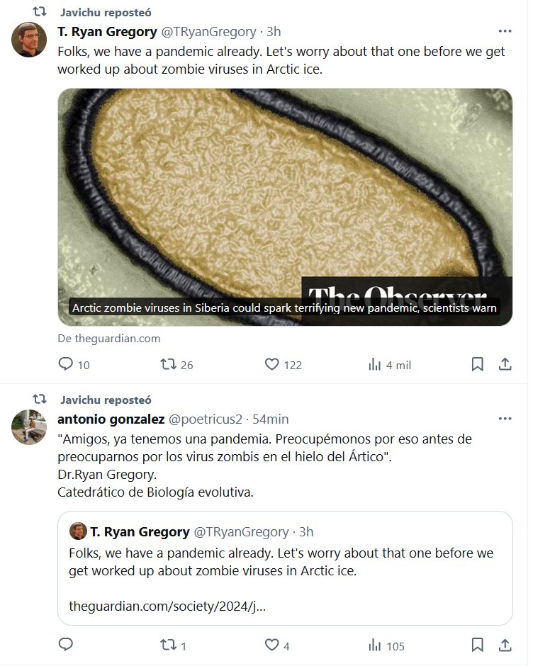 COMO DECÍA EL TANGUERO: «NO TE DISTRAIGAS» «Amigos, ya tenemos una pandemia. Preocupémonos por eso antes de preocuparnos por los virus zombis en el hielo del Ártico». Dr.Ryan Gregory. Catedrático de Biología evolutiva.