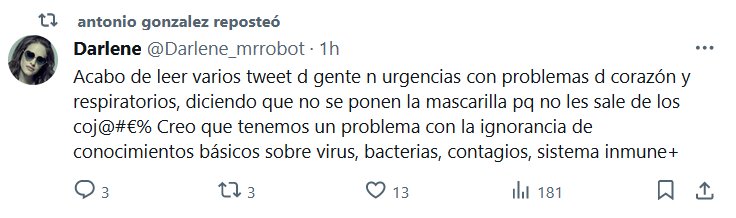 TESTIMONIO Acabo de leer varios tweet d gente n urgencias con problemas d corazón y respiratorios, diciendo que no se ponen la mascarilla pq no les sale de los coj@#€% Creo que tenemos un problema con la ignorancia de conocimientos básicos sobre virus, bacterias, contagios, sistema inmune+