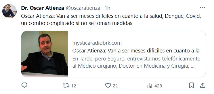 QUE YA NO SE TOMARON, NI EN ESTE GOBIERNO NI EN EL ANTERIOR Oscar Atienza: Van a ser meses difíciles en cuanto a la salud, Dengue, Covid, un combo complicado si no se toman medidas Posted on enero 23, 2024 por coronado https://mysticaradiobrk.com/oscar-atienza-van-a-ser-meses-dificiles-en-cuanto-a-la-salud-dengue-covid-un-combo-complicado-si-no-se-toman-medidas/