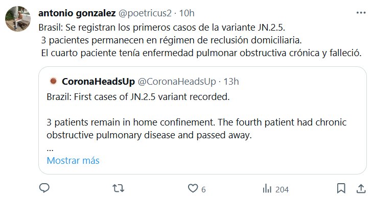 Brasil: Se registran los primeros casos de la variante JN.2.5. : 3 pacientes permanecen en régimen de reclusión domiciliaria. El cuarto paciente tenía enfermedad pulmonar obstructiva crónica y falleció