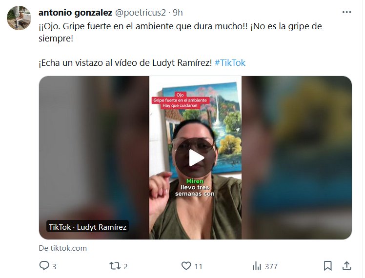 LOS COVIDIOTAS Y SU CEGUERA NEGACIONISTA ¡¡Ojo. Gripe fuerte en el ambiente que dura mucho!! ¡No es la gripe de siempre! ¡Echa un vistazo al vídeo de Ludyt Ramírez! #TikTok Posted on enero 24, 2024 por coronado https://www.tiktok.com/@ludytramirez/video/7321369304463691014?_r=1&_t=8jI1SwTW3jV