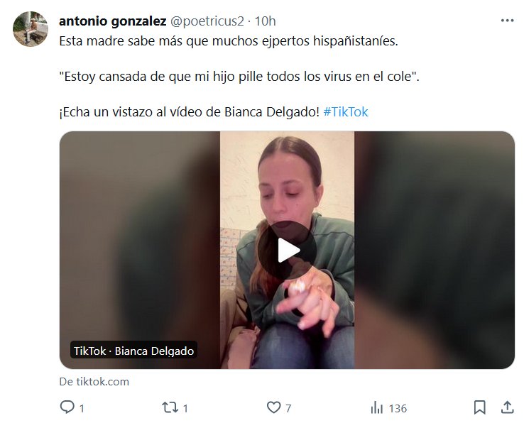LESA HUMANIDAD Esta madre sabe más que muchos ejpertos hispañistaníes. «Estoy cansada de que mi hijo pille todos los virus en el cole». ¡Echa un vistazo al vídeo de Bianca Delgado! #TikTok Posted on enero 25, 2024 por coronado https://www.tiktok.com/@biancadelgado14/video/7325425916111228193?_t=8jJiLUeVz4j&_r=1