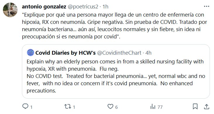 «Explique por qué una persona mayor llega de un centro de enfermería con hipoxia, RX con neumonía. Gripe negativa. Sin prueba de COVID. Tratado por neumonía bacteriana… aún así, leucocitos normales y sin fiebre, sin idea ni preocupación si es neumonía por covid»