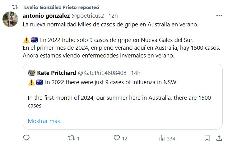 NODIGASCOVID HACE ESTRAGOS La nueva normalidad.Miles de casos de gripe en Australia en verano. ⚠️🇦🇺 En 2022 hubo solo 9 casos de gripe en Nueva Gales del Sur. En el primer mes de 2024, en pleno verano aquí en Australia, hay 1500 casos. Ahora estamos viendo enfermedades invernales en verano.