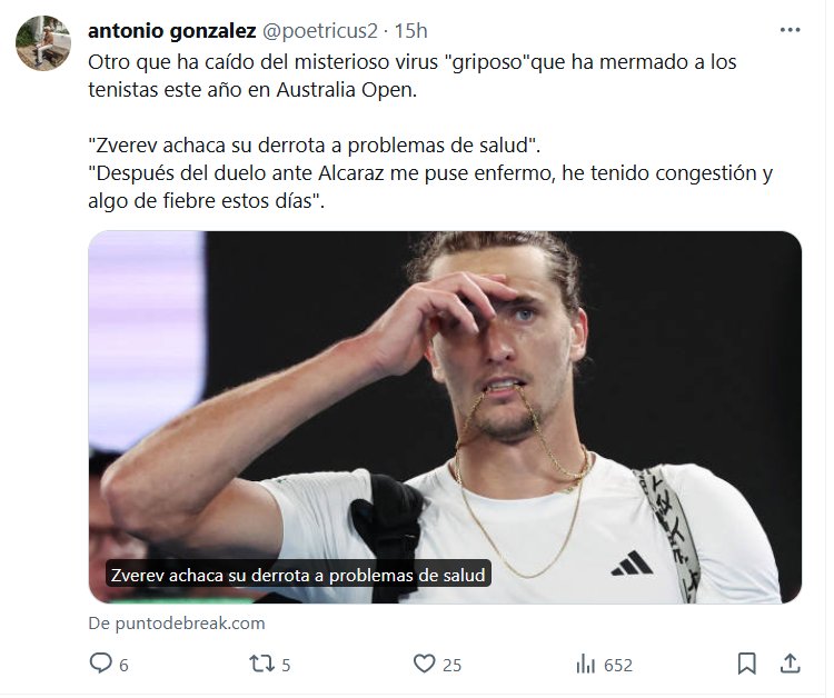 NODIGASCOVID HACE ESTRAGOS Otro que ha caído del misterioso virus «griposo»que ha mermado a los tenistas este año en Australia Open. «Zverev achaca su derrota a problemas de salud». «Después del duelo ante Alcaraz me puse enfermo, he tenido congestión y algo de fiebre estos días»