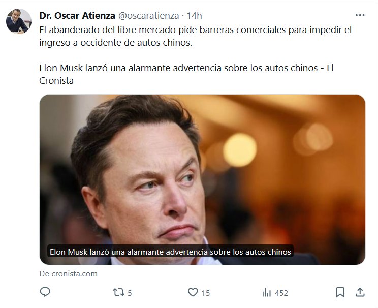 PESTE «MERITOCRACIA» HIPÓCRITA El abanderado del libre mercado pide barreras comerciales para impedir el ingreso a occidente de autos chinos. Elon Musk lanzó una alarmante advertencia sobre los autos chinos