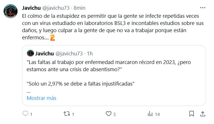 El colmo de la estupidez es permitir que la gente se infecte repetidas veces con un virus estudiado en laboratorios BSL3 e incontables estudios sobre sus daños, y luego culpar a la gente de que no va a trabajar porque están enfermos….🤦