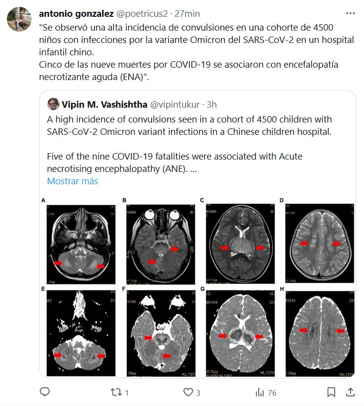LESA HUMANIDAD «Se observó una alta incidencia de convulsiones en una cohorte de 4500 niños con infecciones por la variante Omicron del SARS-CoV-2 en un hospital infantil chino. Cinco de las nueve muertes por COVID-19 se asociaron con encefalopatía necrotizante aguda (ENA)»