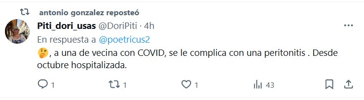 TESTIMONIOS 🤔, a una de vecina con COVID, se le complica con una peritonitis . Desde octubre hospitalizada Posted on enero 31, 2024 por coronado MI APORTACIÓN PERSONAL: MI VECINA CON COVID DESDE MEDIADOS DE 2021 SIGUE CON LAS SECUELAS, CORRIENDO AL HOSPITAL CADA TANTO