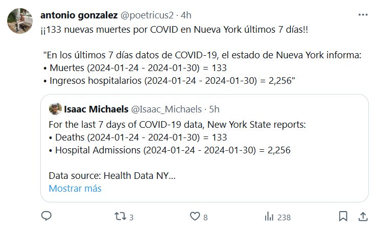 «ES LEVE» ¡¡133 nuevas muertes por COVID en Nueva York últimos 7 días!! «En los últimos 7 días datos de COVID-19, el estado de Nueva York informa: • Muertes (2024-01-24 – 2024-01-30) = 133 • Ingresos hospitalarios (2024-01-24 – 2024-01-30) = 2,256»