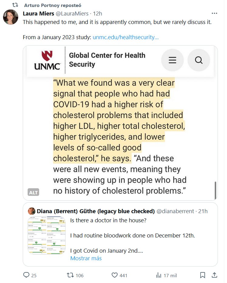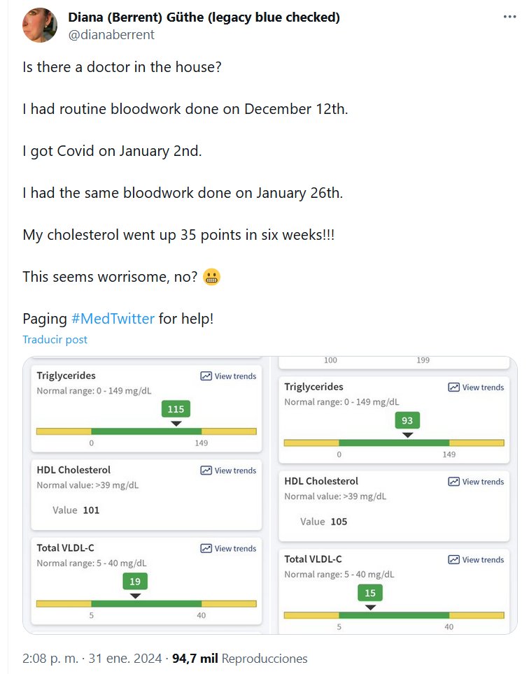 ¿Hay un médico en la casa? Me hicieron análisis de sangre de rutina el 12 de diciembre. Recibí Covid el 2 de enero. Me hicieron el mismo análisis de sangre el 26 de enero. ¡¡¡Mi colesterol subió 35 puntos en seis semanas!!! Esto parece preocupante, ¿no? 😬 ¡Busca ayuda en #MedTwitter!