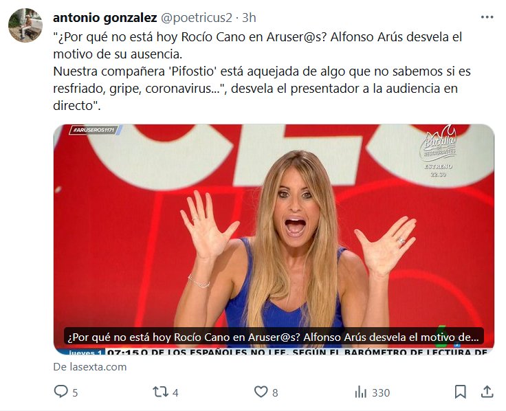LOS COVIDIOTAS TODAVÍA DUDAN! «¿Por qué no está hoy Rocío Cano en Aruser@s? Alfonso Arús desvela el motivo de su ausencia. Nuestra compañera ‘Pifostio’ está aquejada de algo que no sabemos si es resfriado, gripe, coronavirus…», desvela el presentador a la audiencia en directo»