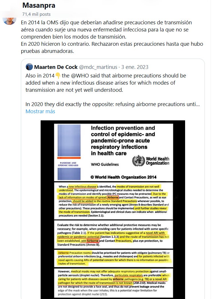 ORGANIZACIÓN MUNDIAL DE LA SALUD O DE LA ENFERMEDAD? En 2014 la OMS dijo que deberían añadirse precauciones de transmisión aérea cuando surje una nueva enfermedad infecciosa para la que no se comprenden bien los modos de transmisión. En 2020 hicieron lo contrario. Rechazaron estas precauciones hasta que hubo pruebas abrumadoras