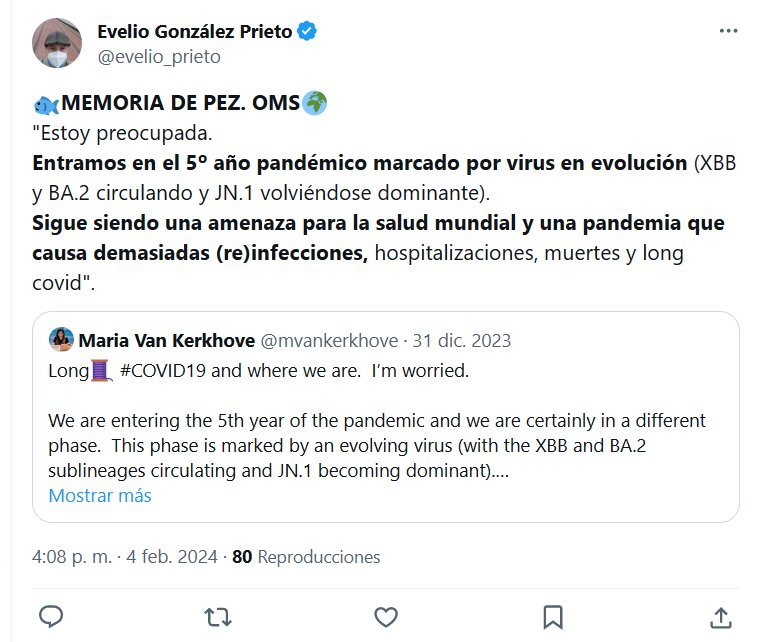 🐟MEMORIA DE PEZ. OMS🌍 «Estoy preocupada. Entramos en el 5º año pandémico marcado por virus en evolución (XBB y BA.2 circulando y JN.1 volviéndose dominante). Sigue siendo una amenaza para la salud mundial y una pandemia que causa demasiadas (re)infecciones, hospitalizaciones, muertes y long covid»