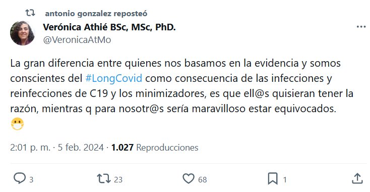 SERÍA MARAVILLOSO! Verónica Athié BSc, MSc, PhD. @VeronicaAtMo La gran diferencia entre quienes nos basamos en la evidencia y somos conscientes del #LongCovid como consecuencia de las infecciones y reinfecciones de C19 y los minimizadores, es que ell@s quisieran tener la razón, mientras q para nosotr@s sería maravilloso estar equivocados. 😷